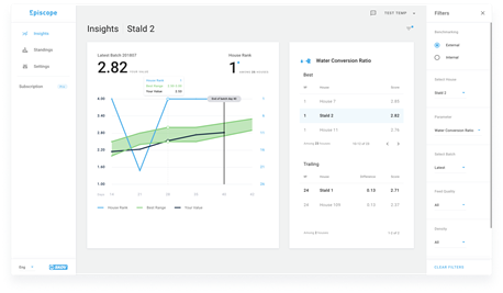 Episcope er et benchmark-program, der er udviklet til slagtekyllingproducenter, så de anonymt kan sammenligne deres landbrugs præstationsparametre med andre landbrug verden over. Forskellige parametre indsamles fra flere sensorer, der er placeret i slagtekyllingehusene, og som omfatter foder, klima (temperatur, luftfugtighed, lys osv.) og produktionsindikatorer. Episcopes analyseværktøj samler indsigtsfulde data, harmoniserer og leverer dem til farmere på en letoverskuelig og interaktiv måde. Værdifulde indblik fremlægges på det foretrukne sprog, en unik repræsentationsmåde forudses for hver type parameter, og alle indikatorer kan ses i detaljeret form for at spore resultater på en tidslinje.